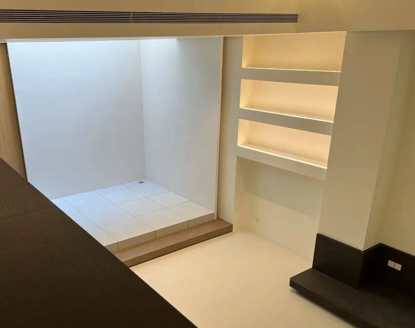 ▲客厅地面:魔术师岩板-极地白 / 地台地面:一品白