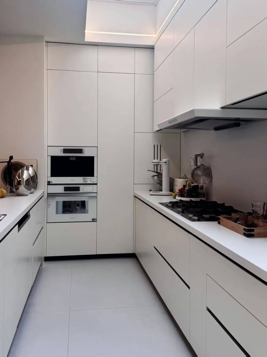 对热爱下厨的蔡文静而言,厨房也是释放自我的重要空间。在这里,地面以冠珠魔术师岩板极地白延续一体大气的极简质感,墙面则同样选用冠珠白色系岩板搭配,高级好看又巨好打理!
